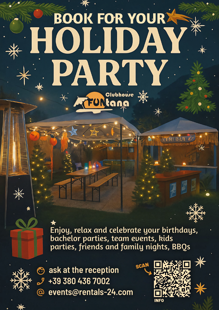 Al FUNtana Clubhouse si respira un'atmosfera natalizia con vin brulé al tiki bar, in compagnia di amici e familiari, con musica e karaoke. Se avete bisogno di aiuti per organizzare la vostra festa invernale noi siamo qui.